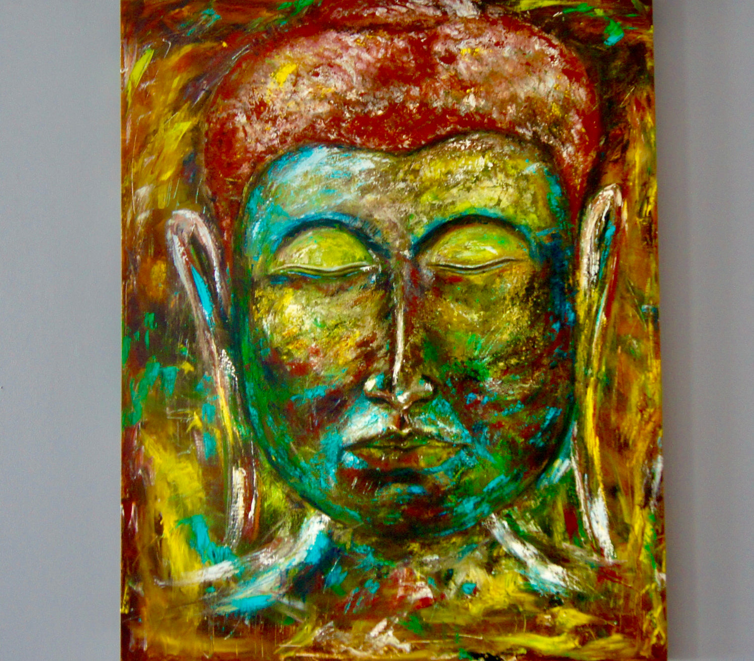 In this captivating painting, the serene face of Buddha emerges amidst a vibrant kaleidoscope of colors. The figure exudes an aura of tranquility and profound inner peace as the eyes remain gently closed, evoking a state of deep meditation and introspection. Each hue adorning the countenance represents a unique facet of the spiritual journey, forming a harmonious mosaic of emotions and experiences. The colors blend and dance together, transcending the boundaries of traditional representation and inviting the viewer to explore the depths of the soul. The closed eyes symbolize the inward focus and detachment from the external world, encouraging reflection and self-discovery. As one gazes upon this mesmerizing artwork, a sense of stillness and interconnectedness permeates the atmosphere, reminding us of the timeless wisdom and universal truths that Buddha embodies. It is an invitation to embark on our own personal quest for enlightenment, embracing the vibrant tapestry of life while seeking inner serenity.