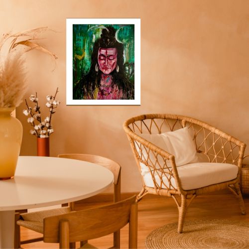 In this captivating masterpiece, the timeless essence of Lord Shiva is brought to life. The celestial aura surrounding the divine figure is palpable, as the Almighty is depicted with a serene smile and closed eyes, emanating an aura of tranquility and profound inner peace. Adorned with a delicate half-moon nestled gracefully amidst flowing tresses, the symbol of Shiva's eternal connection to the cosmic energies is illuminated. Every brushstroke captures the essence of this ethereal being, inviting the viewer to embark on a journey of spiritual introspection. As the divine energy radiates from the canvas, a sense of harmony and transcendence pervades the atmosphere, reminding us of the profound wisdom and serenity that resides within.