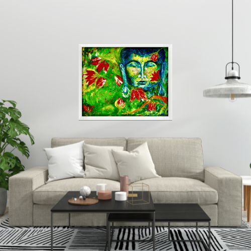 In this captivating artwork, the serene presence of Buddha is embraced by a resplendent garden adorned with vibrant red flowers. The figure of Buddha sits in a state of profound tranquility, radiating an aura of enlightenment and inner peace. The rich crimson blossoms surrounding the enlightened being serve as a vivid reminder of the impermanence and beauty of life. Each delicate petal seems to hold a secret, whispering ancient wisdom and the essence of spiritual awakening. The interplay of light and shadow accentuates the depth and texture of the flowers, enhancing their symbolic significance. As the viewer gazes upon this artwork, a sense of serenity and harmony washes over, inviting contemplation and reflection. The painting serves as a visual meditation, a window into a realm where the profound teachings of Buddha and the ephemeral beauty of nature converge, inspiring us to seek our own path towards enlightenment amidst the ever-changing tapestry of existence.