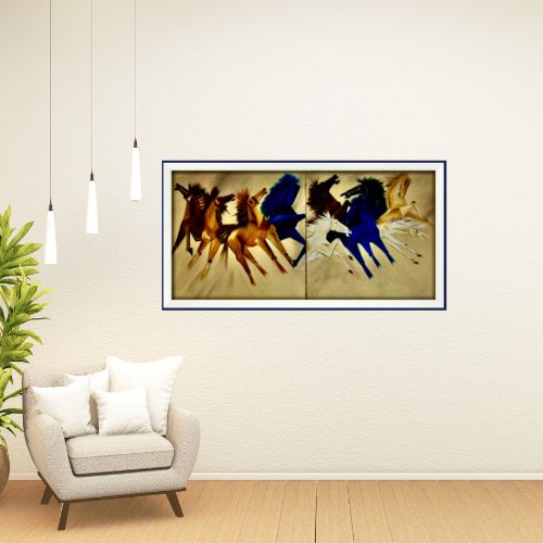 In this captivating painting, a spirited herd of horses gallops across a sun-kissed landscape. Their powerful forms and flowing manes exude a sense of grace and untamed freedom. Each brushstroke captures the dynamic energy and raw strength of these majestic creatures, as they move in harmonious synchrony. The painting's composition showcases the unity and spirit of the herd, evoking a sense of collective power and resilience. The horses' expressive eyes convey a blend of wildness and serenity, inviting the viewer to connect with their untamed essence. As the viewer immerses themselves in this artwork, they are transported to a realm where the spirit of the horse reigns supreme, reminding us of the beauty and spirit of nature's most majestic creatures.